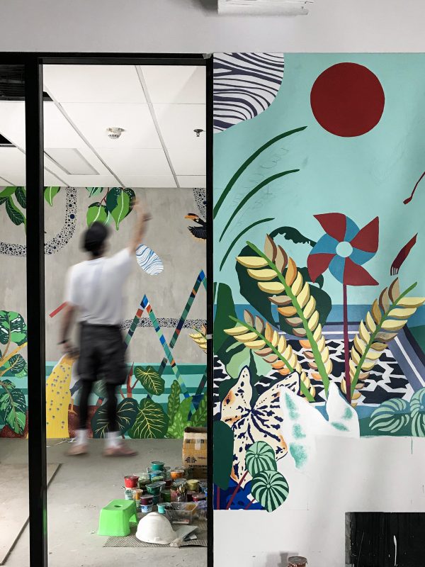 Nous avons collaboré avec des artistes locaux, un couple de Tempa Studio à Yogyakarta. Ils ont utilisé des matériaux bruts naturels pour créer des installations et des peintures murales étonnantes pour le bureau.