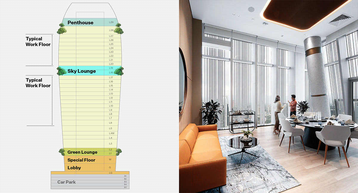 The penthouse includes town hall spaces, entertainment areas and comfortable waiting zones for visitors. Artworks by local artists inspire creativity while enhancing sense of belonging, providing a premium experience for all.