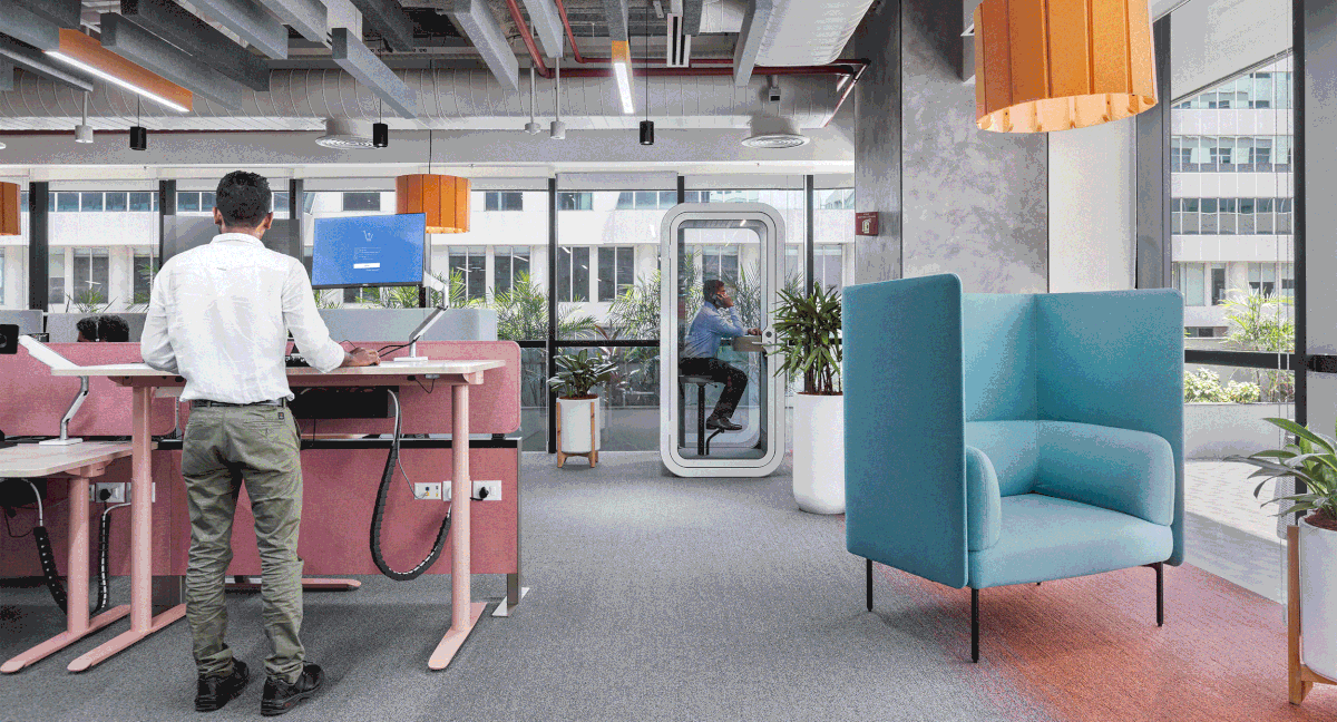 我们在外围区域设置了非固定座位的办公区,让员工可以灵活工作。我们按照使用者的角色划分区域,确保满足团队内部的需求。中央核心区域更多用于会议和团队协作,而外围区域则为专注办公而设计。我们基于行为的设计将使用者及其身心健康置于设计过程的核心。