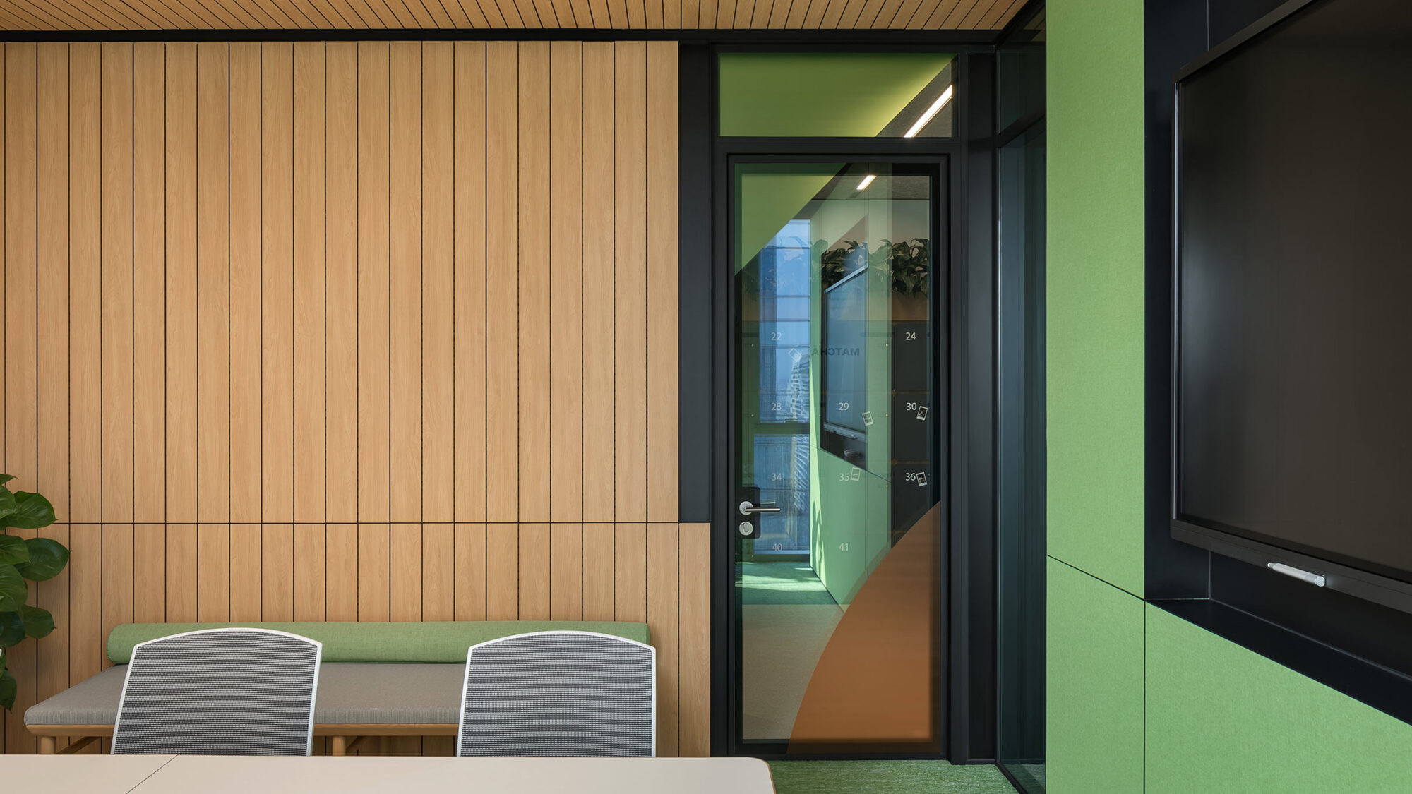 位于前区的“虫洞”装置使位于四大洲各分支的穆氏员工能够实现无须预约的实时沟通;会议室具有先进的语音操控智能会议系统,来实现便捷的办公室内外的会议操作;休息室中可调节的氛围照明和声学设计,使员工能够在办公空间里感受大自然的环境。