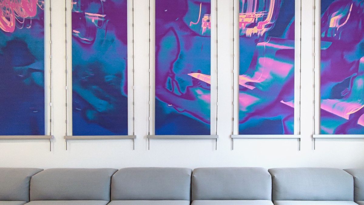 我们特意避免使用地毯,而是通过对地板的巧妙设计和五楼走廊的特别布局,模拟户外跑步体验。墙面上艺术作品则是灵感来源于员工跑步照片的抽象热量图,以艺术形式展现企业品牌文化。