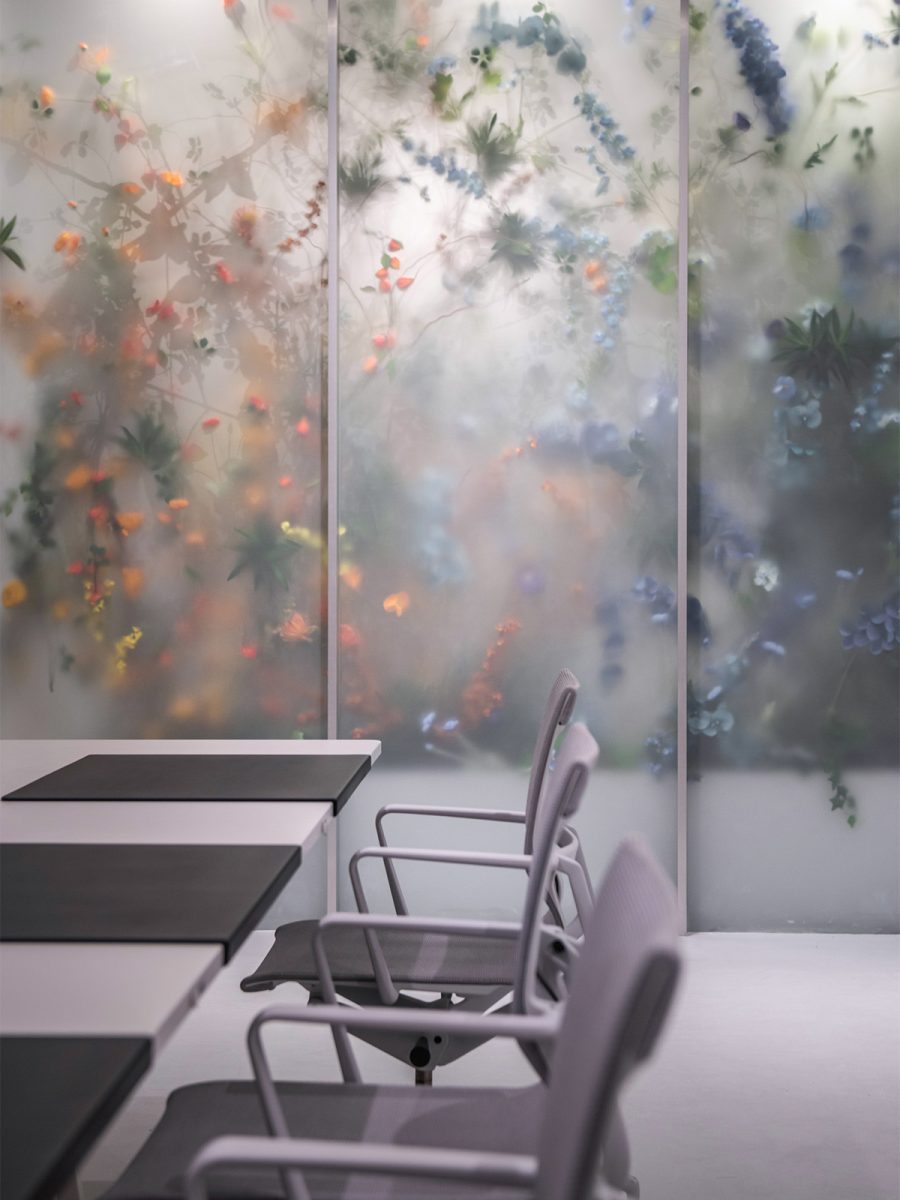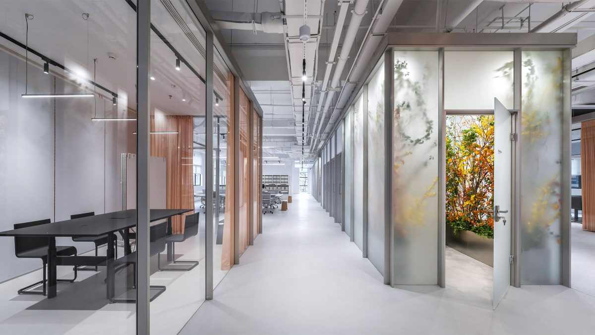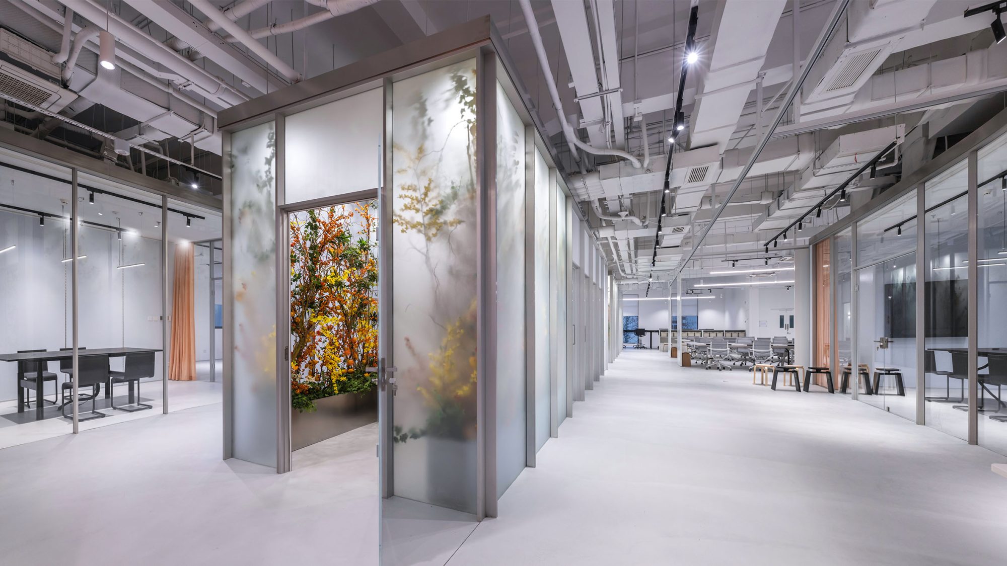 为进一步提升员工的专注度和工作效率,我们设计了春夏与秋冬两个主题的专注空间。这些空间巧妙地利用植物装饰,营造出绿意环绕的宁静氛围。透过磨砂玻璃窗,隐约可见的花丛不仅美化了办公环境,也为员工带来了一片身心健康的绿洲。