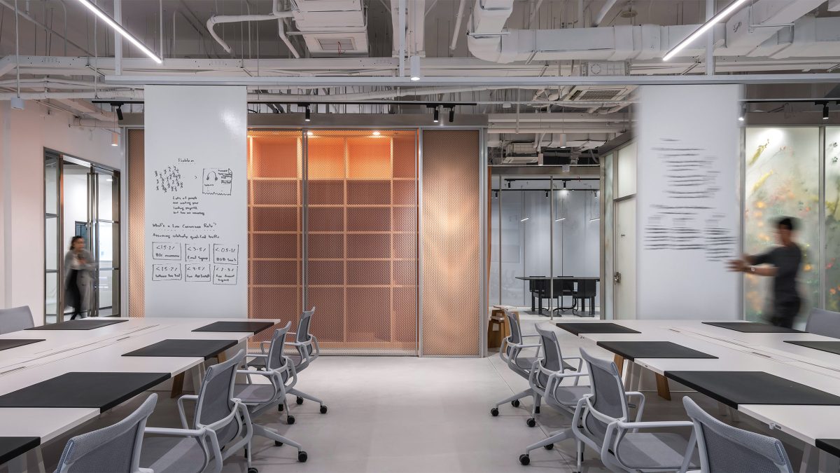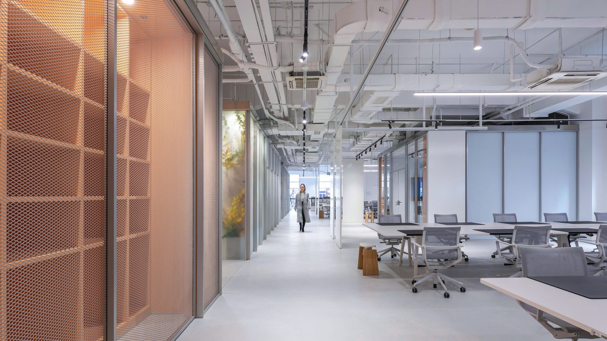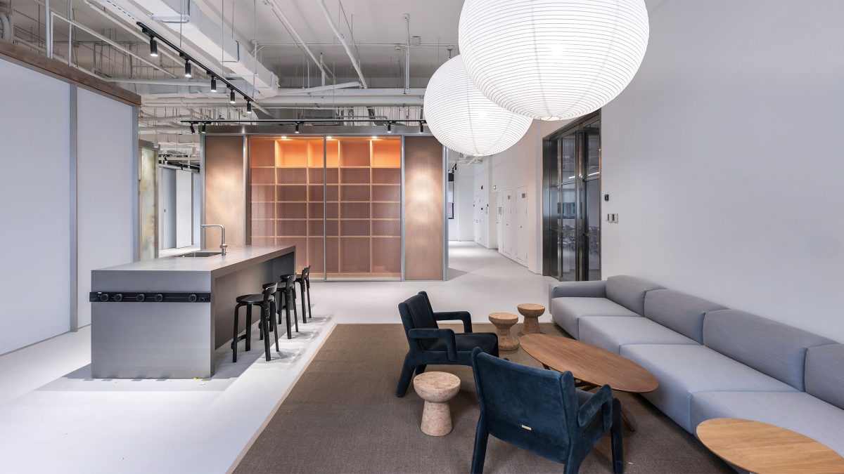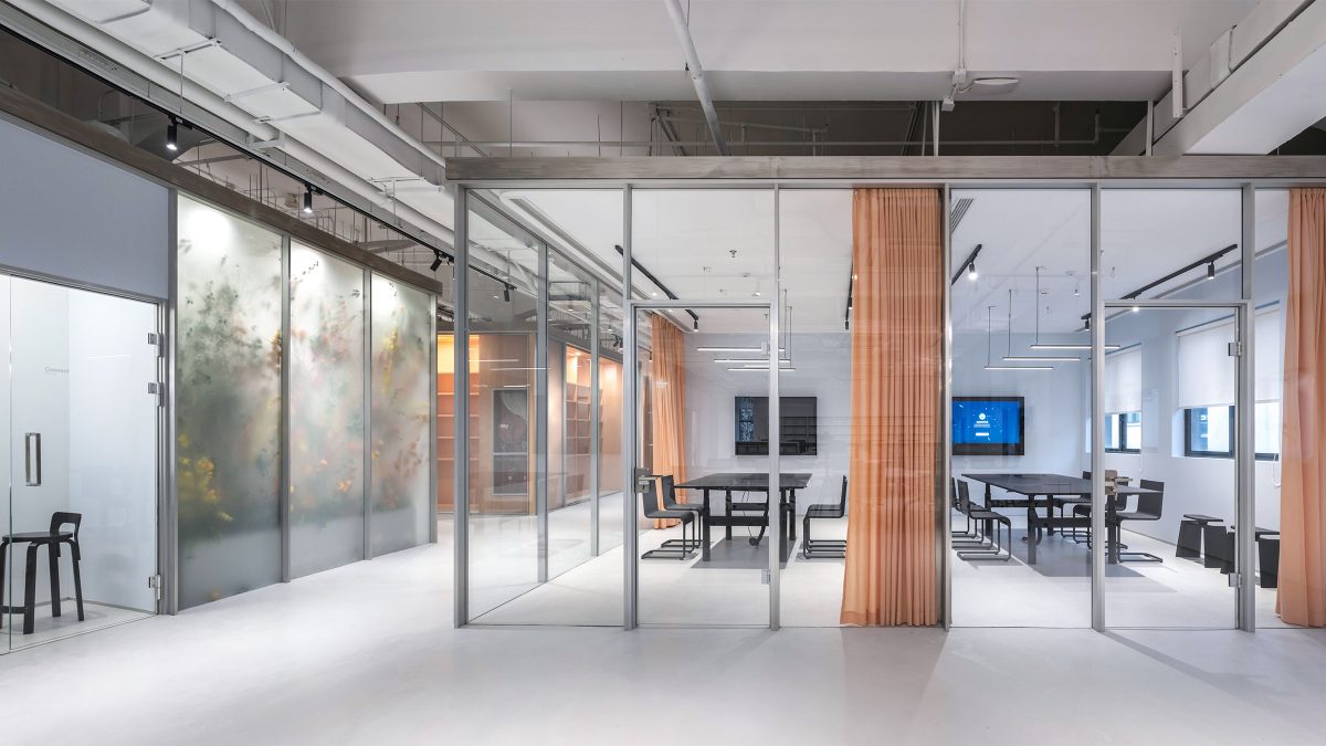 以标志性金属灰色作为整体基调,并运用蓝色和橙色作为明亮色系的点缀,通过视觉元素为使用者营造记忆深刻的品牌触点。此外,我们在专注室和会议室使用磨砂材料,这不仅保障了空间的私密性,营造引人探索的目的地,同时呼应了“Mystical Utopia神秘乌托邦”理念。