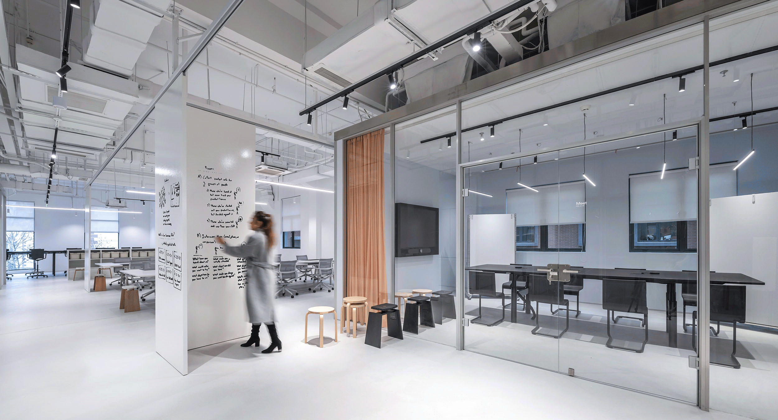 创意空间通过一套可移动的白板装置,极大提升了灵活性。这些白板贯穿整个办公场所,可根据需要重新布局,使员工能在任何地点进行头脑风暴和会议记录,它们还能灵活打造出私密或开放的办公空间。这样的设计让办公环境得以迅速适应多样的工作需求,实现空间的动态调整和个性化配置。