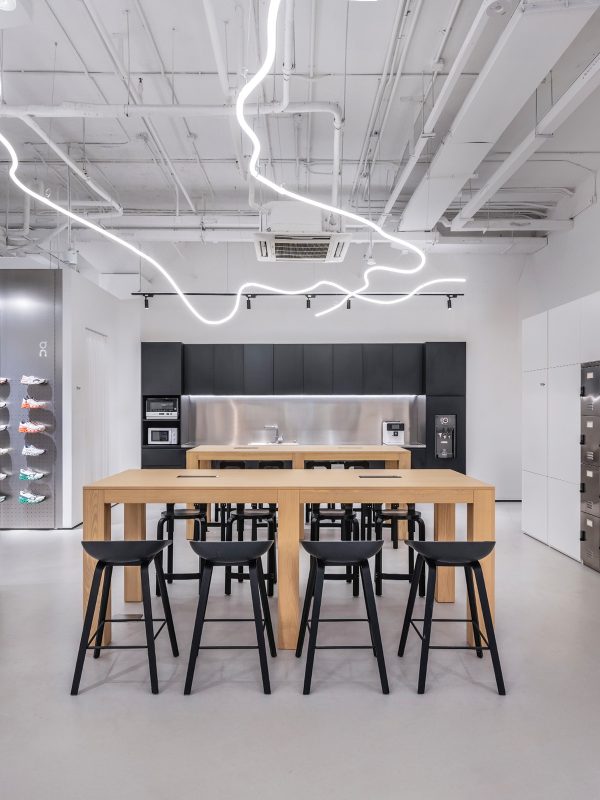 此外,空间中充分融入了上海本土特色,我们将曲折蜿蜒的灯条置于一楼厨房和Play Area的上方。这些灯条模拟了围绕上海的三条著名跑步路线,将上海的历史和活力巧妙地融入其中。