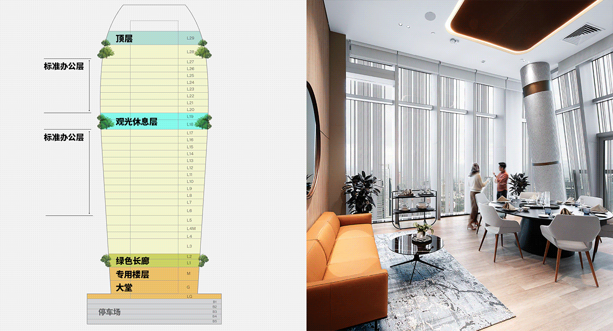 18层和19层的观光休息室为员工身心健康而设,配备有讨论区、休息室、室内公园和游戏空间。此外,顶楼餐厅、M层的艺术画廊和多功能大厅等公共空间亦对员工和访客开放,以促进社群氛围。建筑的独特设计鼓励走动与交流,打造出充满活力的空间。